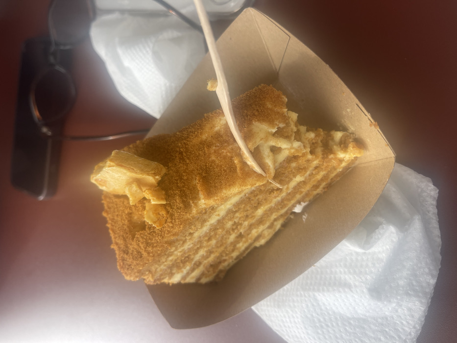 - "A slice of multi-layered cake, resembling a Medovik or honey cake, is depicted in a brown cardboard takeaway container, resting on a crumpled white paper napkin" by FM-ZDm2H3, licensed under CC BY 4.0