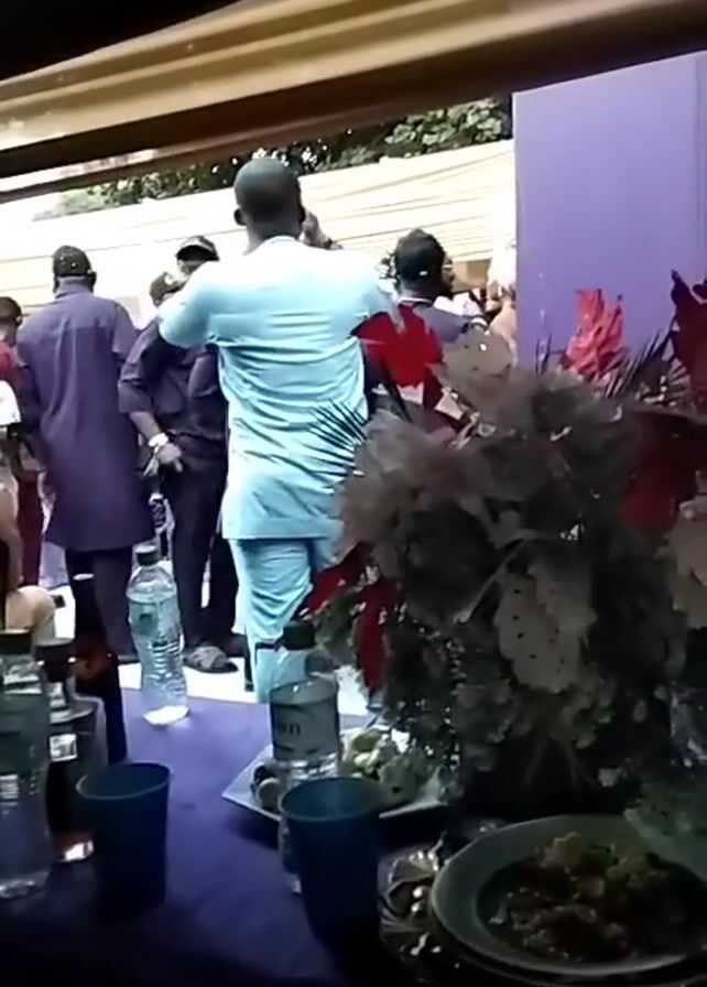 group of people standing and talking outdoors, seemingly at an event or gathering. They are dressed in a variety of clothing, including traditional African attire. A table in the foreground is draped with a purple cloth and holds water bottles, alcohol bottles, cups, plates, and a decorative floral arrangement. The atmosphere appears lively, suggesting a social event. The camera is mostly static.