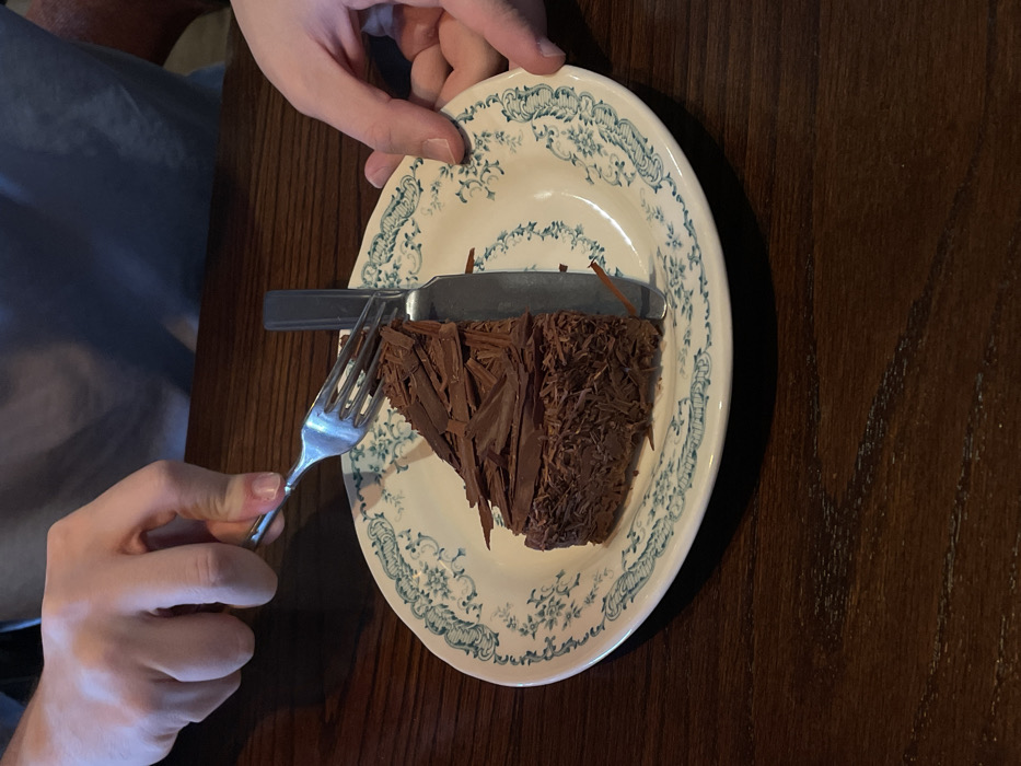 In Tsamakaberd, Armenia, a close-up overhead shot captures a dessert on a dark brown wooden table. A triangular slice of dark chocolate cake, extensively covered with chocolate shavings, is centered on a round white ceramic plate featuring a light blue floral pattern around its rim. A person's left hand, visible in the upper left quadrant, grasps a silver-colored four-tined fork, positioning it over the top left portion of the cake. To the right of the cake, a dark-handled knife lies flat on the plate. A second person's right hand, visible in the mid-right, holds the edge of the plate. The upper torso of an individual wearing a light blue shirt is partially visible in the background.