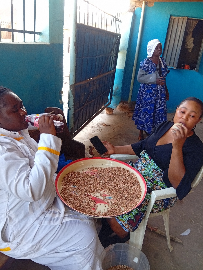 The scene is set in an outdoor or semi-outdoor area in Dadi Riba, Nigeria, characterized by bright blue painted walls, a partially open dark blue metal gate, and a concrete or packed earth ground. Three adult females are present. In the left foreground, a woman wearing a white uniform with yellow stripes on the cuffs is seated, drinking a red liquid from a clear plastic bottle. To her right, another woman in a black top and a colorful patterned skirt is seated, holding a black smartphone in her left hand and bringing her right hand to her mouth, appearing to eat or taste something. A large, round, cream-colored tray with a red rim, filled with light brown beans and scattered colorful fragments, rests between these two seated women. A clear plastic bucket containing more beans is on the ground near the second woman's feet. In the background, a third woman stands, dressed in a blue patterned long dress and a white head covering, with a grey arm sling supporting her left arm. She is looking towards the right of the frame, away from the foreground subjects.