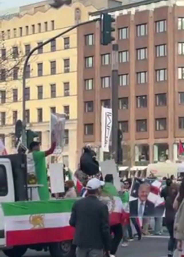 group of people demonstrating on a city street. A white truck decorated with an Iranian flag drives slowly along the road. People on the truck wave Iranian flags and hold signs with images. Some march alongside the truck carrying Iranian flags, a Palestinian flag, and an Israeli flag. Tall buildings line the street in the background, and a traffic light is visible. The sky is overcast.