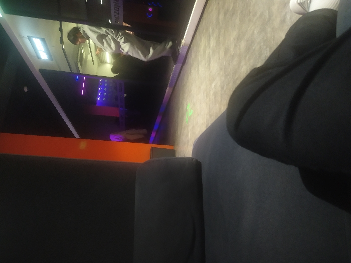 The image depicts an indoor entertainment complex, identified as a "GameZone," likely located at Next Park in Tashkent, Uzbekistan. The scene is viewed from a low, first-person perspective, with the photographer seated on a dark upholstered couch or bench, their legs clad in dark trousers and a white sneaker visible in the lower right. The environment is dimly lit with mood lighting, featuring an orange vertical accent wall on the left and a large, reflective surface or mirror dominating the right midground. Behind this reflective surface, a male figure wearing a light grey tracksuit stands, leaning slightly, and appears to be examining a small handheld object, possibly a mobile phone. Other indistinct figures are visible in the darker background. Neon lights, including purple and pink hues, illuminate sections of the wall and interactive elements within the game zone. The floor is a light grey, textured surface, with a distinct green illuminated marking visible on the ground.