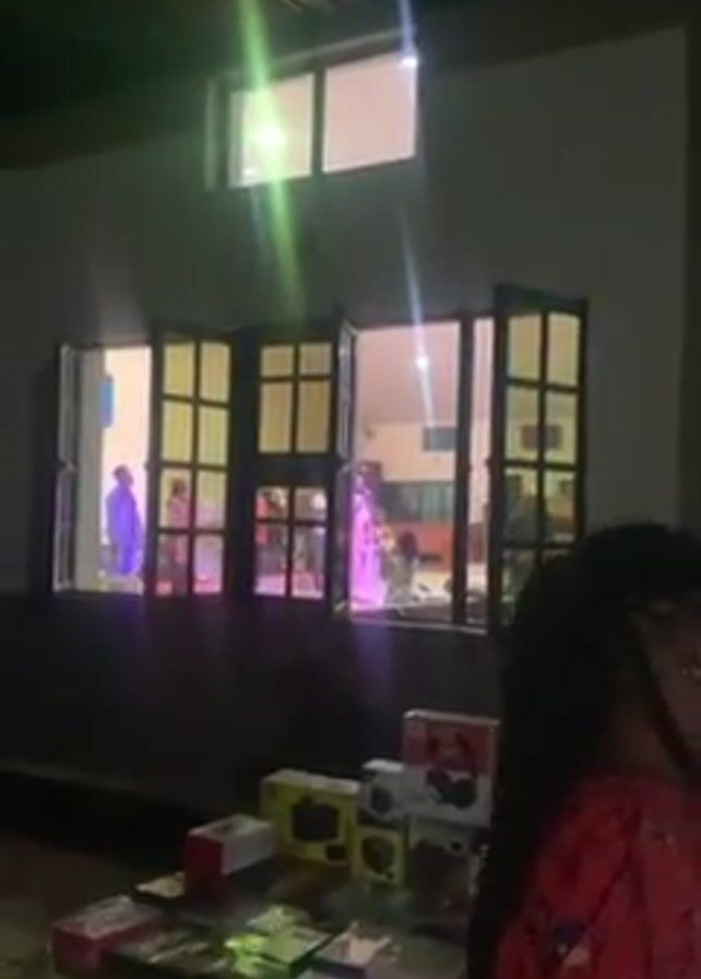 From an outdoor perspective, the video shows a room inside a building, visible through a series of windows. Inside, several people are present. One person stands at a podium, seemingly giving a speech or presentation. In the foreground, a table is laden with various boxes, possibly containing goods for sale or distribution. A person in a red floral shirt is partially visible in the foreground, obscuring the view somewhat. The time appears to be night, with the building illuminated from within.
