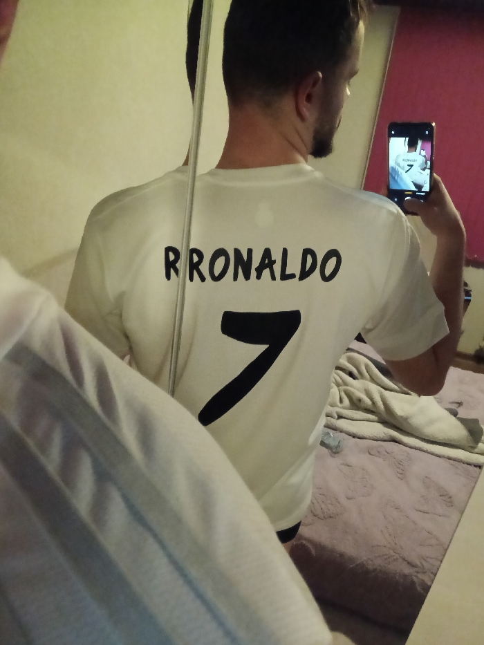 A male subject is captured from the back in a mirror selfie taken within an indoor room. The subject, visible from the shoulders up, has short dark hair and a beard. He is wearing a white short-sleeved t-shirt with the name "RRonaldo" and the number "7" printed in black on the back. The man is holding a black smartphone in his left hand, angled to capture his reflection in the mirror. The phone's screen displays a clear image of his reflection, showing the same t-shirt. The environment includes a light-colored wall to the left, a magenta or deep pink wall to the right, and a bed with textured purple bedding in the lower right portion of the frame. A crumpled light-colored blanket or towel and a small, clear plastic bottle are visible on the bed. The room is illuminated by warm lighting. The image itself is a photograph of a mirror, evidenced by the reflection and a visible vertical seam or edge of the mirror on the left.