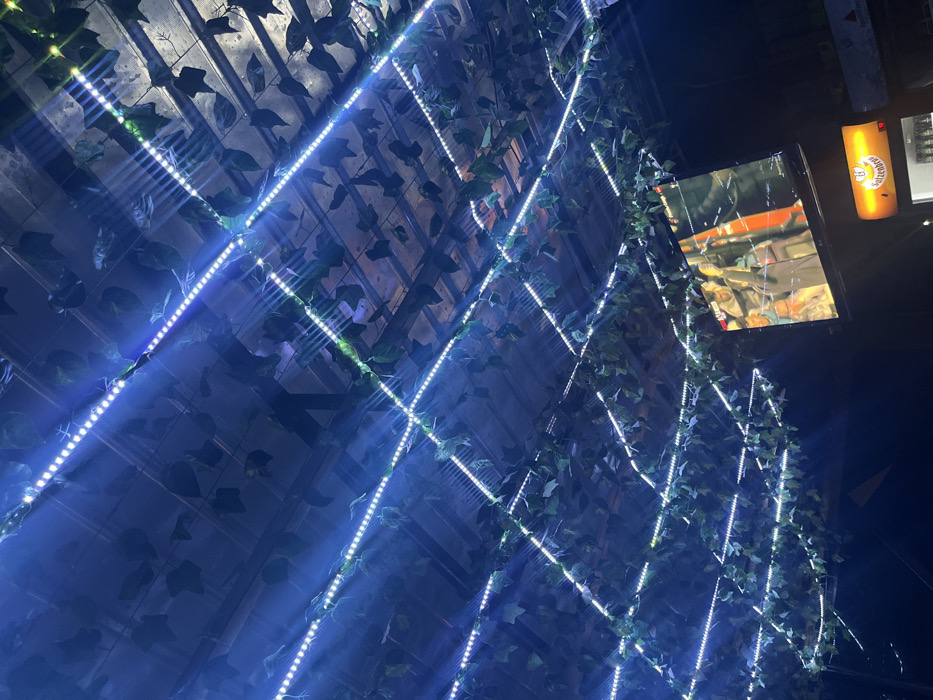 A low-angle shot reveals a ceiling adorned with faux ivy and intersecting strings of blue LED lights, creating a diamond pattern