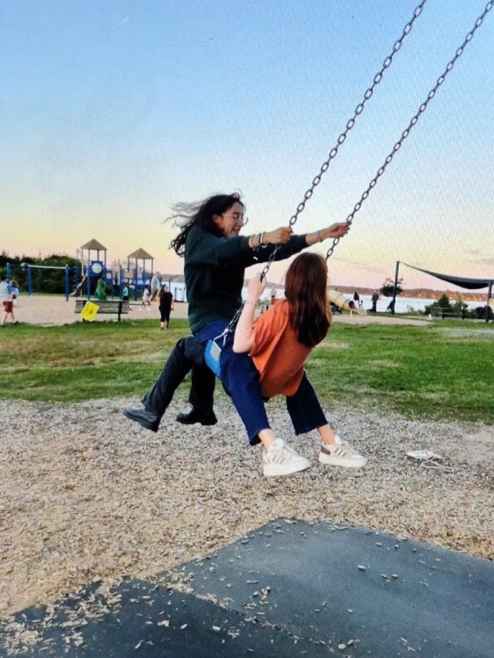 In an outdoor playground in Otta, Norway, at dusk, two individuals are interacting with a swing set