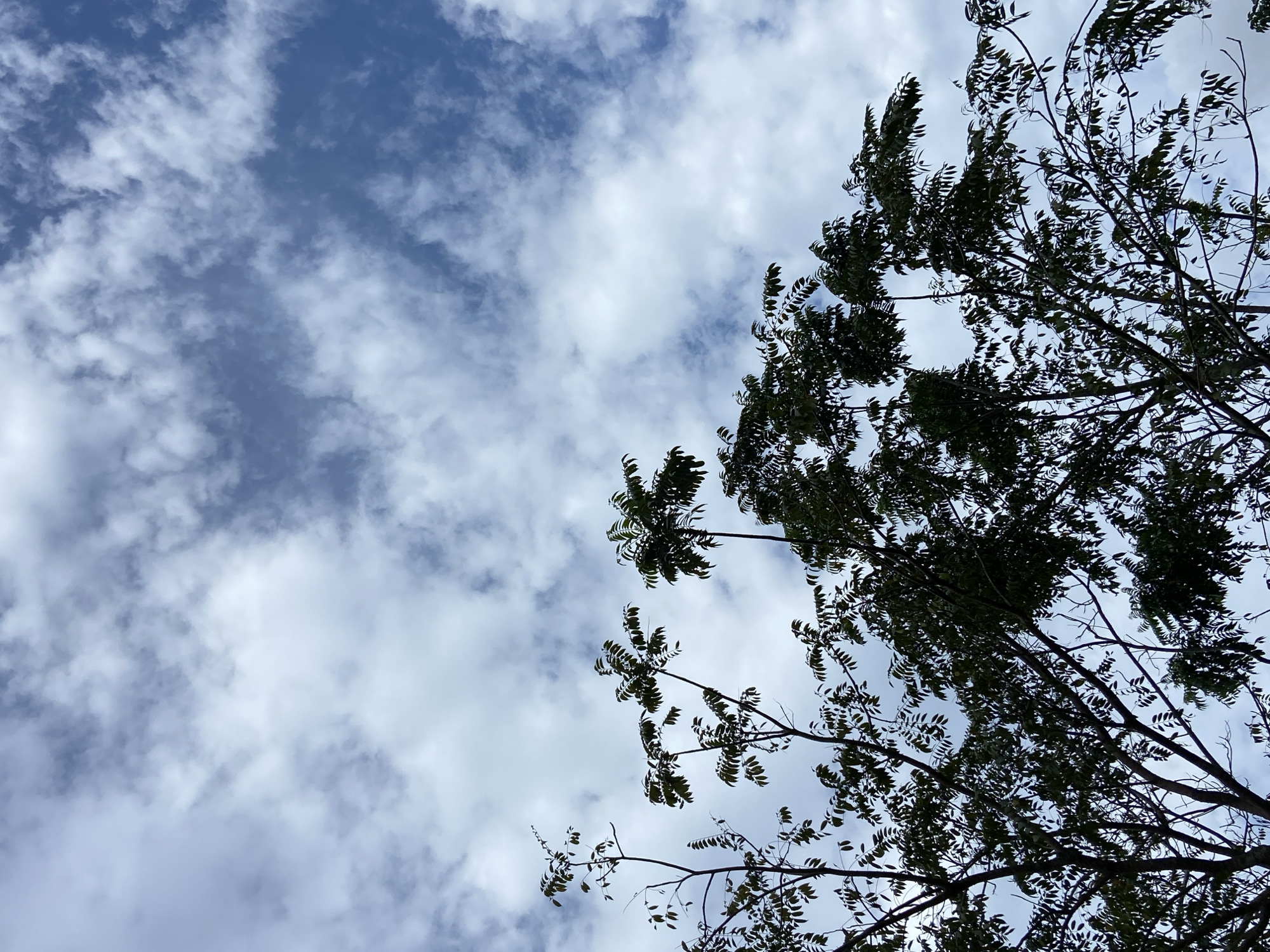 view looking up towards a partly cloudy sky, with tree branches and leaves silhouetted against the sky