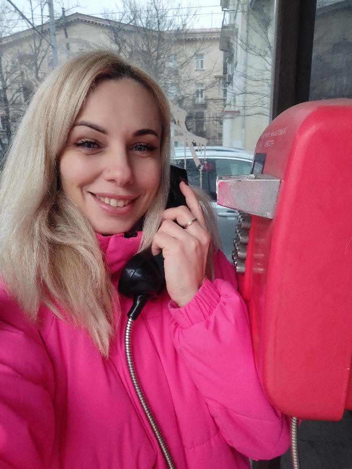 A blonde female subject, approximately 25-35 years old, with blue eyes and a small silver nose stud, is depicted in a medium close-up. She is smiling broadly, revealing her upper teeth, and looking directly into the camera. She wears a bright fuchsia-pink puffer jacket. On the ring finger of her left hand, she has a thin metallic band ring. She holds a black telephone receiver to her left ear, connected by a coiled metallic cord to a red public telephone unit, which is partially visible on the right side of the frame. Through a window or transparent enclosure behind the subject, an urban street scene is visible. This includes multi-story buildings with architectural details and bare deciduous trees, suggesting a winter or late autumn season. A light-colored automobile is also partially visible in the background. The sky is overcast. The scene is located in Sevastopol, Ukraine.