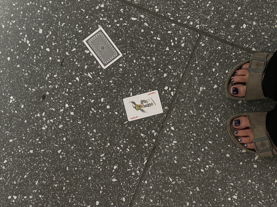 The scene presents a top-down view of a dark grey terrazzo floor with white and light grey aggregate. Prominent grout lines form a T-intersection across the surface. Two playing cards are visible: one Joker card lies face up, depicting a jester in a black, yellow, and red striped costume. The second card lies face down, revealing a white and black intricate patterned back, consistent with a standard playing card deck. In the lower portion of the frame, a person's feet are present, clad in light brown, open-toed sandals with a single strap and buckle. The toenails are painted with dark, glittery polish. No specific location within Tel Aviv, Israel, is identifiable from the visual information provided.