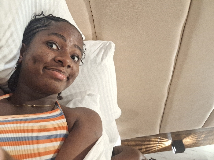A young woman with braided hair smiles at the camera while lying on a white pillow. She wears a striped orange and blue tank top and a gold necklace. Behind her, there's a large headboard with vertical beige panels. At the bottom right corner of the frame, there is a small, black sconce emitting light patterns on a surface below. The photo is taken from a high angle, suggesting the photographer is positioned above the subject.