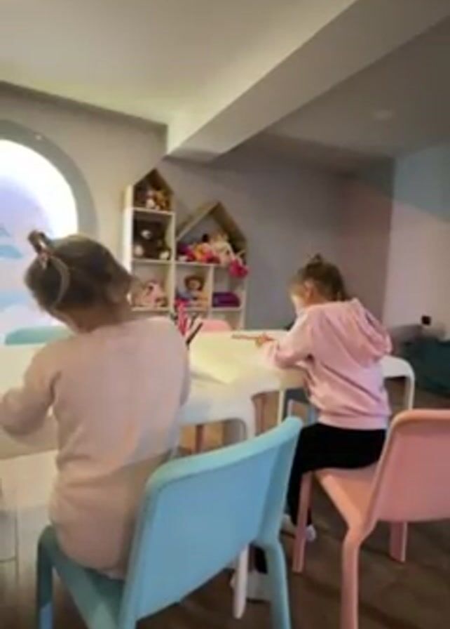 Two young girls are sitting at a white table, drawing on white paper. The girl on the left is wearing a pink sweater and the girl on the right is wearing a pink hoodie and black pants. The girls are sitting on chairs, one light blue and one pink, respectively. The room appears to be a playroom, with a round window showing a space scene in the background and a shelf filled with stuffed animals.