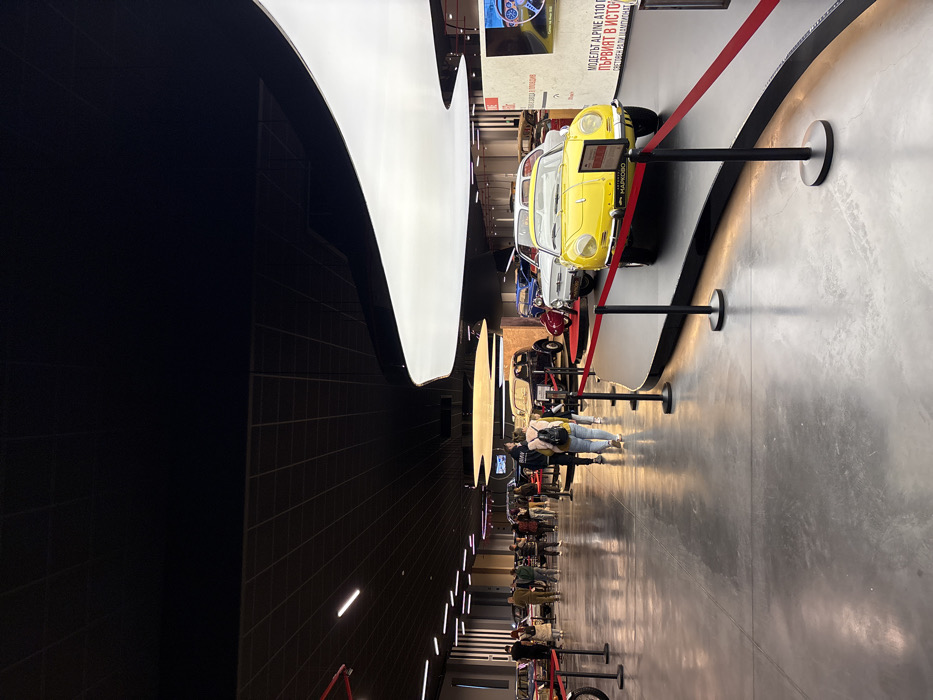 The image captures an indoor museum exhibition at the Retro Museum in Markovo, Bulgaria. The expansive hall features a polished, reflective gray concrete floor and a dark ceiling with a visible grid pattern, illuminated by linear fluorescent lights and large, undulating white light fixtures. In the foreground right, a bright yellow classic sports car, identified by "МУЗЕЙ МАРКОВО" (Museum Markovo) on its front, is displayed on a raised black platform. A red velvet rope, supported by black stanchions, delineates a viewing boundary around this vehicle. A white informational sign next to the car, partially obscured, shows text in Bulgarian including "МОДЕЛ ALPINE A110" and "ПЪРВИЯТ В ИСТОРИЯ". Behind the yellow car, additional classic automobiles are visible, including a white, a light blue, and a dark-colored sedan or coupe. In the midground, a group of approximately 15-20 casually dressed individuals are observing the exhibits, predominantly moving towards the right side of the frame. Two individuals are walking away from the viewer in the mid-left foreground. Further into the background, a large collection of vintage cars in various colors are arranged for display.