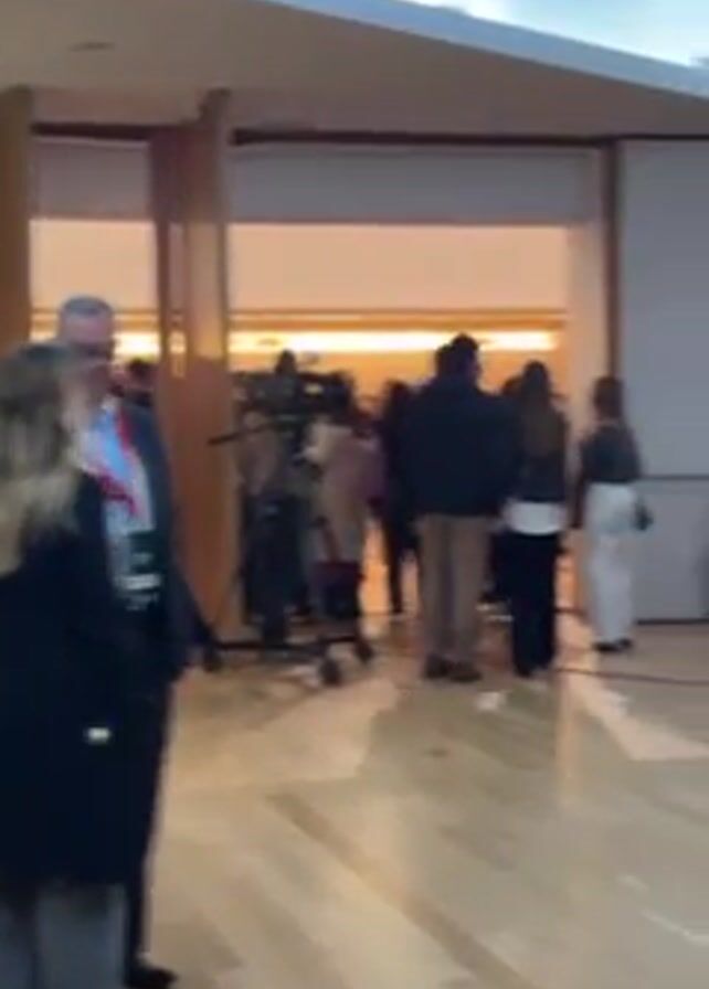crowd of people in what appears to be a brightly lit lobby or event space. Many individuals are dressed in formal attire, and some are holding cameras and microphones, suggesting a press conference or event with media presence. The background includes wooden panels and open doorways, indicating an interior space. People are mingling and moving around. Some are standing in groups, while others are walking through the crowd. Overall, the scene depicts a gathering of people, with a focus on media activity.