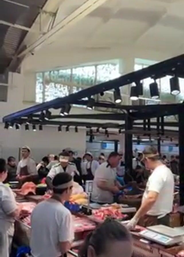 busy indoor market. There are numerous people, many of whom appear to be shopping for meat at a butcher counter. Butchers wearing white uniforms, gloves, and visors are cutting meat behind the counter. Customers are crowded around, looking at the selections. Above the meat counter is a modern black metal structure with lighting. The market has high ceilings with industrial ductwork. In the background, there is a sign written in a language other than English, advertising "Nuts Dried Fruits Spices". The overall impression is of a bustling marketplace with a focus on meat sales.