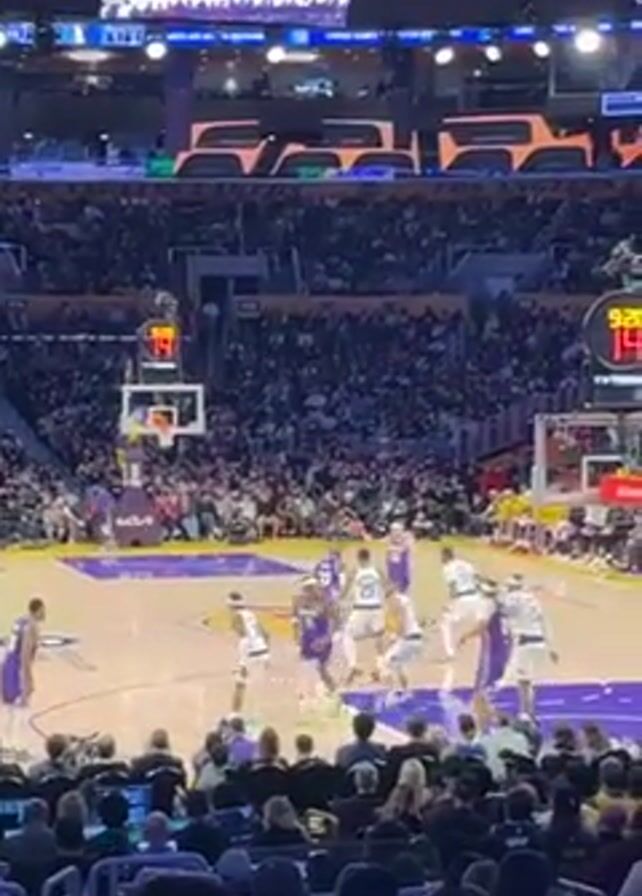 The video captures a basketball game in progress, taking place on a brightly lit court surrounded by a large crowd of spectators