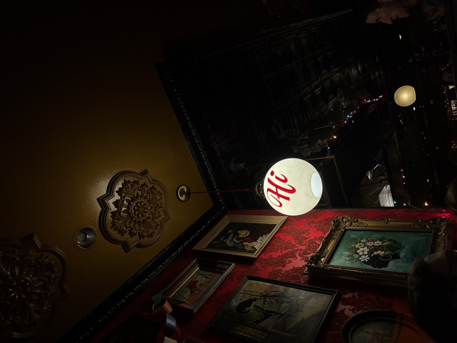 A dimly lit interior shows an ornate wall with decorative carvings and framed paintings on a red patterned surface. Above, a globe-shaped light fixture displays the word "Hi" in red. The ceiling is textured and dark, with glimpses of other lights and decorative elements. The overall ambiance is vintage and artistic, with a touch of whimsy.