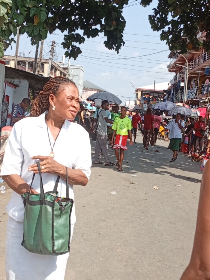An older woman with braided hair and a white outfit holds a green and black tote bag, positioned on the left side of a bustling street