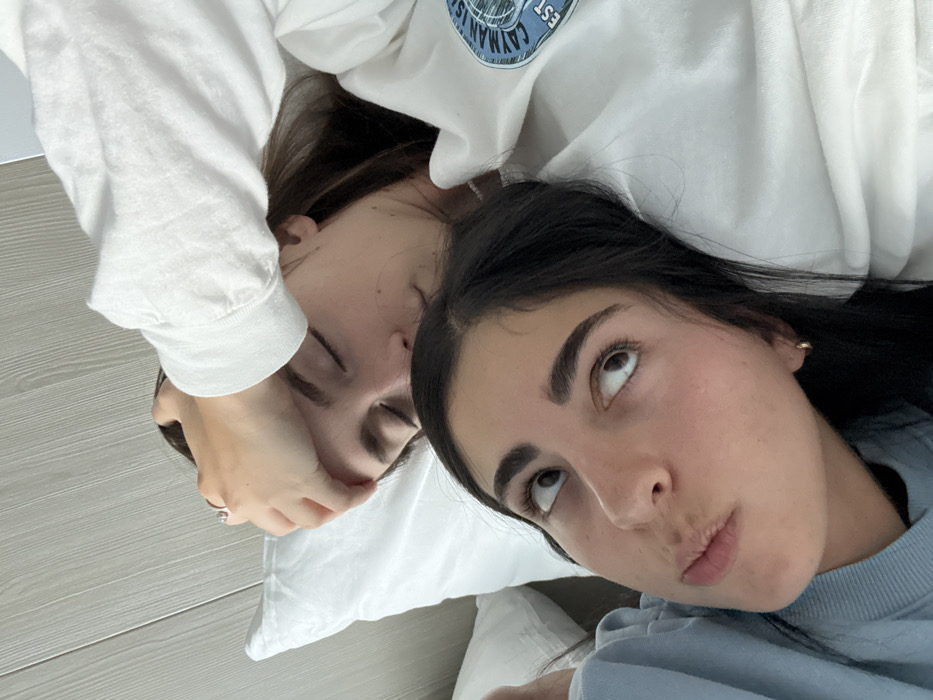 The image depicts two females in an indoor bedroom setting, in the city of Unknown, Unknown. The foreground subject, possessing dark hair and a light complexion, is positioned on her left side, looking upward and to the right with a pensive expression, her lips slightly pursed. She wears a light blue long-sleeved garment and a small gold hoop earring in her visible right ear. Directly behind her and slightly elevated on a white pillow is a second female subject, also with dark hair. This individual's eyes are closed, indicating rest or sleep. Her left hand is placed on her forehead, displaying a ring on her left ring finger. She wears a white long-sleeved shirt with a partial graphic design on the chest, revealing text such as "CAYMAN ISL" and "EST". Both individuals are situated on a bed with white pillows and white bedding. The background consists of a light grey wall with subtle vertical paneling.