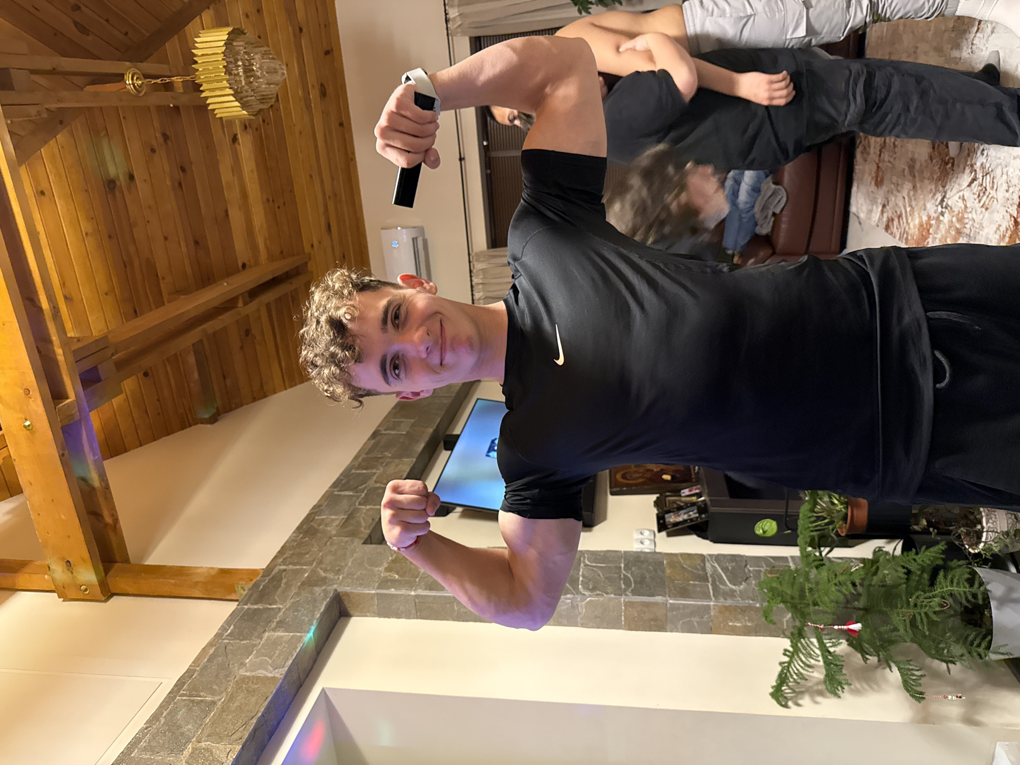 An indoor scene in Berkovitsa, Bulgaria, features a young adult male in the foreground, flexing his biceps and smiling directly at the camera