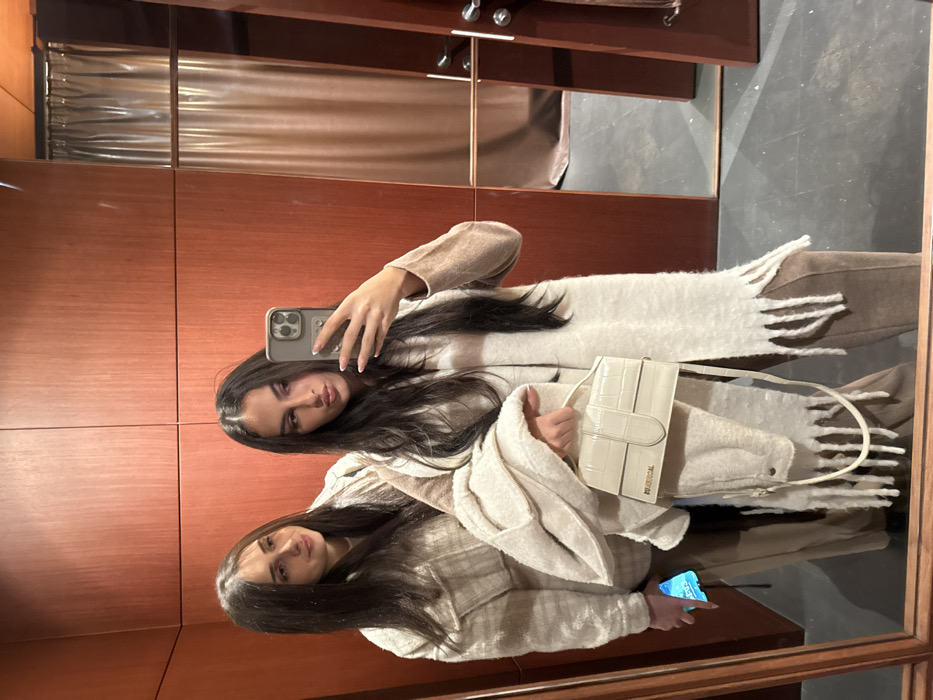 A young woman takes a selfie in a mirrored dressing room. She holds a smartphone and wears a light-colored coat, scarf with fringe, and a cream-colored purse. Her dark hair cascades down her shoulders. The reflection shows a similar outfit, giving the illusion of two women. The dressing room features wood paneling, clothes racks, and a gray floor.