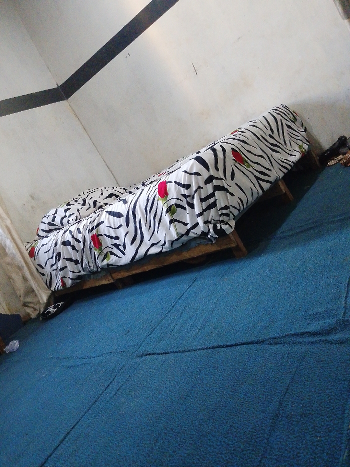 The image depicts the interior of a room within an unspecified residential or temporary dwelling in the city of Unknown, Unknown. A bed, composed of a mattress resting on a visible wooden pallet frame, is positioned along a light-colored wall towards the right side of the frame. The mattress is covered with a white sheet or duvet featuring a black zebra stripe pattern and scattered red rose designs. The bedding appears slightly disheveled. The floor is covered by a blue, low-pile carpet or mat, exhibiting visible creases and wear. Two light-colored walls meet in the upper-left, with a dark horizontal band running along the upper portion of one wall. A light-colored curtain hangs on the far left. A pair of black and white patterned open-toed footwear is visible on the blue carpet near the left side of the bed. Indistinct dark objects are present on the floor at the far end of the bed, against the wall. No individuals are present.