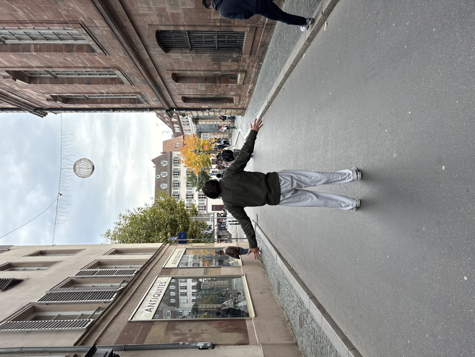 The image presents a street scene in Strasbourg, France, viewed from a slightly elevated perspective. The sky is overcast and light grey. In the immediate foreground, centered on a dark grey asphalt street, a person stands with their back to the camera, arms extended horizontally to each side. They are wearing a dark olive-green long-sleeved top, light grey sweatpants, and light-colored sneakers. The asphalt surface exhibits a few scattered light-colored specks. To the left, a multi-story building with a light beige or pale pink facade runs parallel to the street. Its upper floors display numerous windows fitted with dark, closed louvered shutters. The ground floor features a retail establishment labeled "ANTIQUITES" with large, reflective display windows. These windows mirror elements from the opposite side of the street, including buildings and figures. A cobblestone sidewalk borders this building. Further down the street on the left, several trees show autumnal foliage with shades of green, yellow, and orange. To the right, a multi-story building constructed from reddish-brown cut stone also runs parallel to the street. It features tall, narrow windows, some protected by dark metal grates. A second individual, wearing a dark hoodie and dark pants, is partially visible on the cobblestone sidewalk along this building, facing away from the camera, near the right edge of the frame. In the mid-distance on the right, an ornate gateway or entrance is discernible, beyond which additional pedestrians are present. Suspended overhead, against the cloudy sky, is a decorative street light arrangement featuring a string of smaller lights and a prominent, spherical, metallic-mesh ornament. In the background, at the end of the street, additional historic buildings, some appearing to have a half-timbered or traditional Alsatian architectural style, are visible, along with more pedestrian activity.