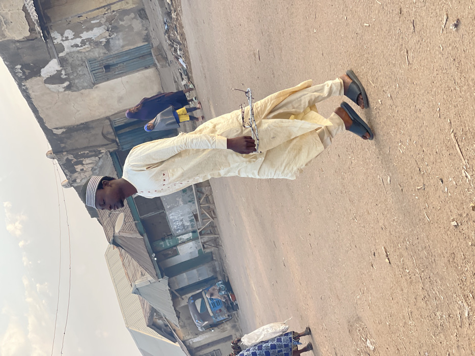 In a bustling street scene, a man dressed in a light yellow traditional outfit and a cap holds prayer beads. He stands on a dusty road with various pedestrians and vehicles visible in the background, some of whom appear to be vendors. The buildings lining the street show wear and tear, adding to the scene's urban atmosphere. The scene is bathed in bright sunlight.