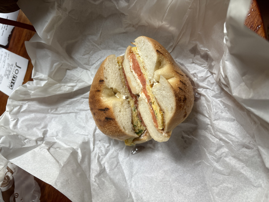 A bagel sandwich, sliced in half, rests on crumpled white parchment paper. The bagel has grill marks and appears to be filled with cream cheese, salmon, and some type of herb omelet. A receipt with "Joma" printed on it is visible in the lower-left corner, suggesting the sandwich was purchased from that establishment. The background includes a wooden surface.