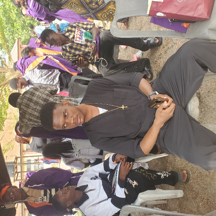 An outdoor gathering is depicted in the city of Ihiagwa, Nigeria. In the foreground, three young adult males are seated on plastic chairs. The central figure, wearing a black V-neck top, black trousers, and a visible gold-colored cross pendant, holds a smartphone and looks towards the right. To his left, another male in a white and black polo shirt and patterned dark trousers holds papers, looking towards the right. To the central figure's right, a male wearing eyeglasses, a yellow and black plaid shirt with a "T3278 SAINT" badge, and paint-splattered dark trousers is engrossed with a smartphone and dangling white earphones. The ground consists of dry, light brown earth. In the mid-ground and background, numerous individuals are present, many wearing purple academic stoles or sashes over their attire, indicating a formal or ceremonial event. A standing male in an orange cap and purple stole with an ID badge is visible to the left. Other background figures are mingling, and some appear to be adjusting their purple garments. Structures, possibly buildings, are visible in the blurred background, along with sparse vegetation. The scene is illuminated by natural daylight, likely under a canopy or shaded area, suggested by the overhead dark structure and consistent lighting.