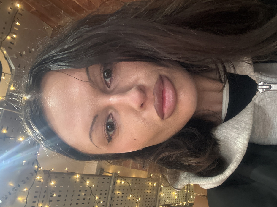 A female individual is depicted in a close-up, head-and-shoulders, frontal selfie. She has dark, wavy hair, centrally parted, framing her face. Her eyes are dark brown, with visible eyeliner. Her lips appear full. A small dark mole or blemish is present on her left cheek (viewer's left). She is wearing a light grey hooded sweatshirt with a silver zipper, layered over a black garment, with a dark outer jacket also partially visible. The background is an out-of-focus indoor environment, characterized by a casual commercial aesthetic. To the left, a light-toned metal structure, possibly a ventilation conduit or shelving, is decorated with multiple strands of small, warm-toned string lights. A section of exposed red brick wall is visible behind the subject's right side. The lighting is predominantly artificial and warm, with a distinct bright light source creating a lens flare in the upper central portion of the image. The setting suggests a pub, cafe, or restaurant environment. The image contains no specific architectural features, signage, or landmarks to identify a precise address or named establishment within the city of Tonbridge and Malling, United Kingdom.