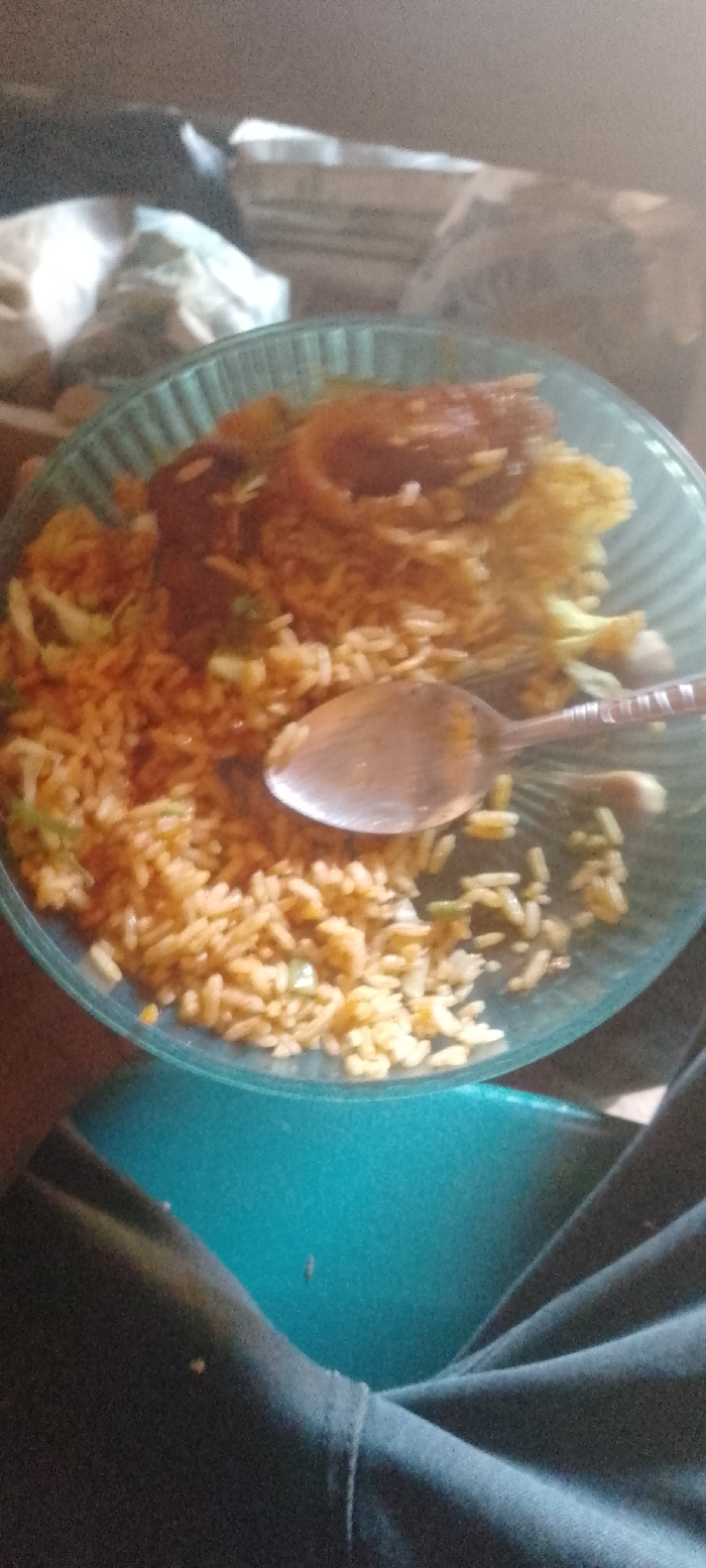 An overhead close-up view depicts a partially consumed meal contained within a transparent, ribbed, light blue plastic plate. The meal consists primarily of yellow-orange fried rice, interspersed with small green vegetable fragments, lighter vegetable pieces, and several reddish-brown sauced items, including a prominent ring-shaped object near the top. A silver-colored metal spoon is positioned within the food, extending diagonally from the center-left towards the upper right. The plate rests on a bright teal-colored surface, which is situated above the dark-colored fabric of an individual's lap, visible in the lower foreground. The background is out of focus, showing indistinct light and dark fabric objects, consistent with an indoor domestic setting. No people are fully visible.