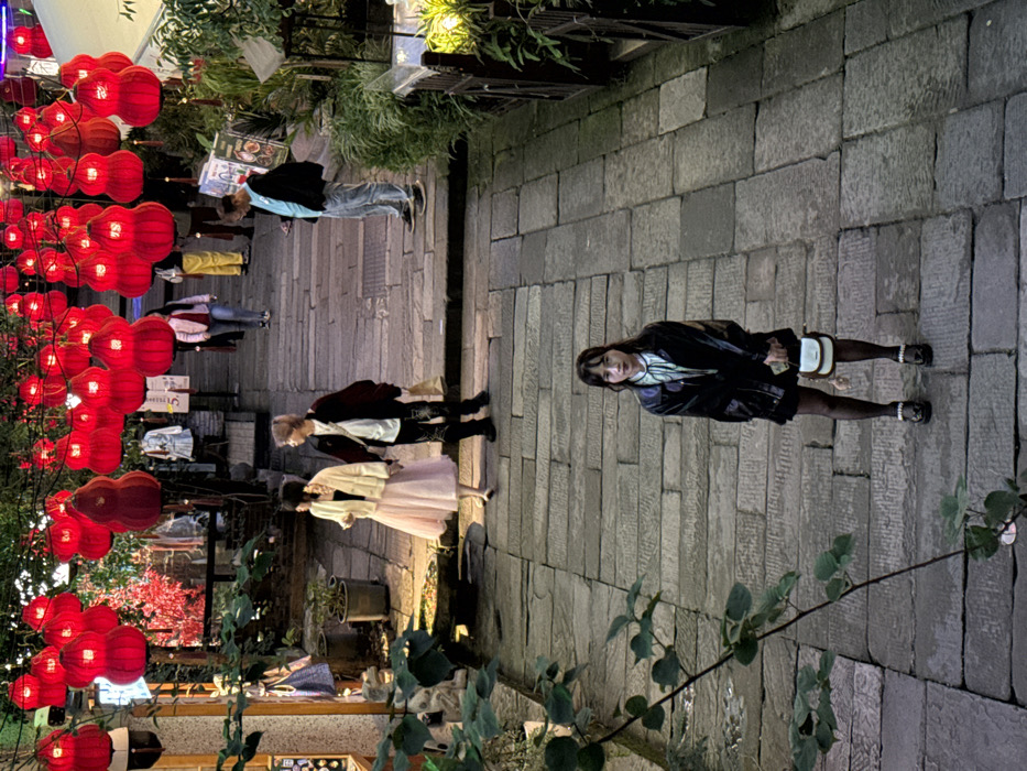 The image depicts an outdoor street scene in Nan'an District, China, characterized by numerous red lanterns strung overhead. A young East Asian woman stands in the foreground, centered, looking directly forward. She wears a black leather jacket, a white blouse with a light green bow or tie, a dark skirt, dark tights, and black patent leather Mary Jane shoes adorned with pearls. She holds a small, two-toned (white and tan) shoulder bag in her left hand, which has a small, light-colored furry charm attached. The ground is a stone-paved walkway composed of large, rectangular slabs, forming a gradual incline upwards. A leafy green plant branch extends into the lower left of the frame. Further up the walkway, in the mid-ground, a young East Asian couple walks together, holding hands. The woman on the left wears a light-colored cardigan over a dark top and a long, light pink skirt. The man on the right has light-colored hair and wears a dark red jacket over a white shirt and dark pants with white distressed accents; he carries a light-colored paper bag in his left hand. In the upper mid-ground, a man in a light blue t-shirt and jeans stands on the right side, looking downwards. Behind him, green foliage borders the pathway. Further up and to the left, another individual wearing a red top and blue jeans is visible. The street is densely covered overhead with dozens of red, gourd-shaped lanterns, some illuminated, casting a warm glow. On the left side of the walkway, details of shopfronts are visible, including potted plants and clothing items on display. On the right, green plants and a wooden structure are present. The overall setting appears to be an evening or nighttime scene in a bustling pedestrian area.