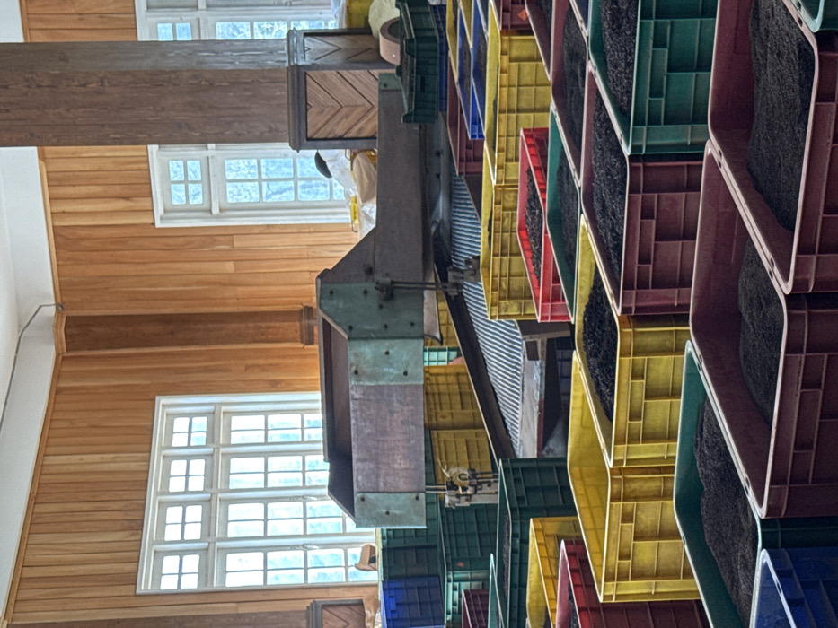 This image depicts the interior of a tea processing facility in Ramboda, Sri Lanka