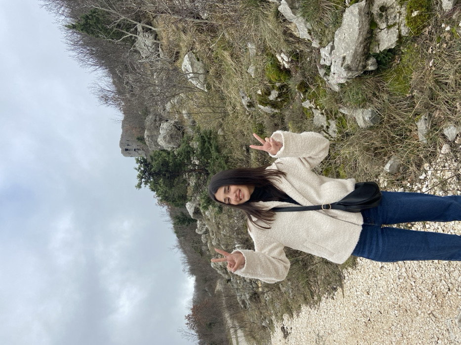 A single female subject stands on a light-colored gravel path in Brajici, Montenegro, facing forward with a slight smile