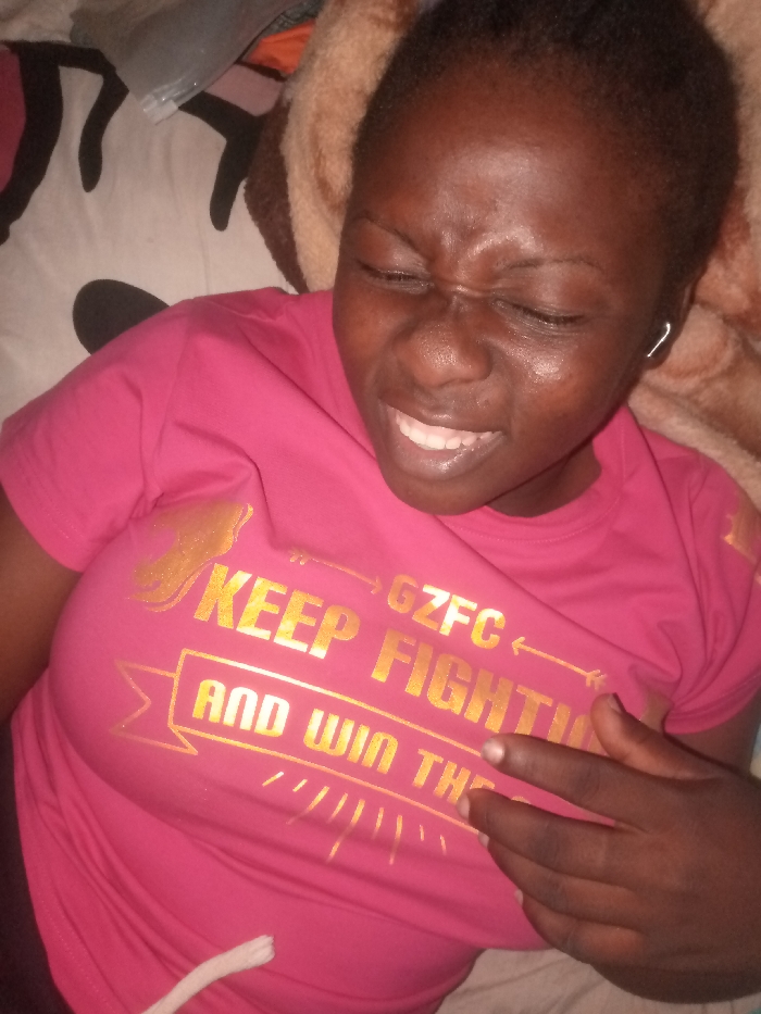 An individual with dark skin is depicted lying prone on a surface, consistent with a bed, in the city of Agban, Nigeria. The subject wears a fuchsia short-sleeved t-shirt featuring gold-colored text: "GZFC KEEP FIGHTING AND WIN TH". Their facial expression shows eyes tightly closed, furrowed brows, a wrinkled nose, and an open mouth revealing teeth, indicating acute discomfort or exertion. Beads of perspiration are visible on the forehead and right cheek. A white C-shaped ear cuff adorns the helix of the right ear. The subject's right hand rests on their lower chest/upper abdomen. The immediate background includes a white patterned sheet beneath the individual and a brown textured blanket behind the head. Partially visible objects in the upper left background include a grey item and orange fabric. A white cord is visible in the lower left foreground.
