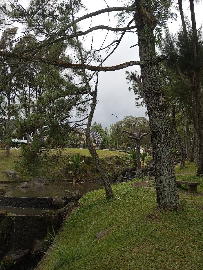 A serene landscape showcases a tranquil pond with rocky edges and a tiered concrete structure. Lush green grass covers the foreground, dotted with scattered trees. A bench rests under the trees, suggesting a peaceful retreat. In the distance, buildings blend with the natural setting under an overcast sky, creating a harmonious blend of nature and architecture.