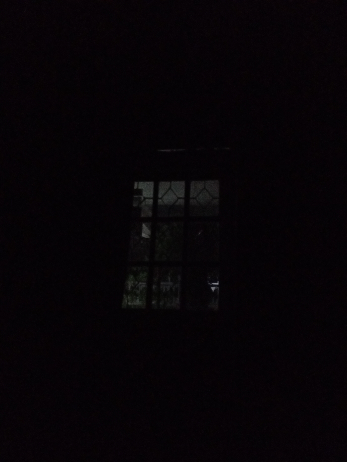 The image depicts a nighttime or heavily darkened exterior view of a building in Qorday, Kazakhstan. Centrally positioned, a multi-pane window is visible, framed by an otherwise indistinguishable dark wall. The window features a grid of mullions, with some panes exhibiting a diamond or criss-cross pattern, possibly from decorative leaded glass or an external security grille. Light emanates from beyond the window, illuminating the immediate outdoor environment. Through the glass, dark foliage, consistent with trees or bushes, is discernible, along with a faint, indistinct outline in the lower right pane that suggests the presence of a vehicle. No individuals or specific actions are visible within the frame.
