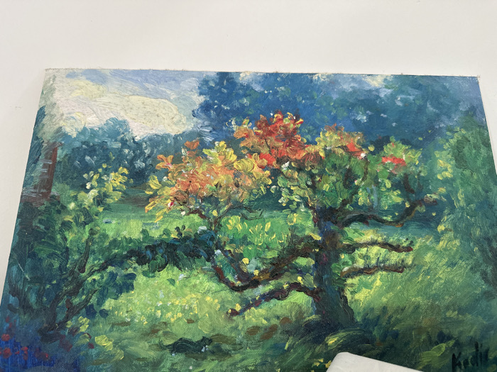 The image is a photograph of an oil painting, rendered in an impressionistic style, depicting an outdoor garden or park scene