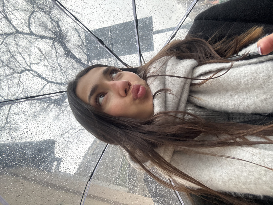 - "A female individual is depicted in a close-up, upward-angled portrait, positioned outdoors under a transparent umbrella" by FM-fSbZr2, licensed under CC BY 4.0
