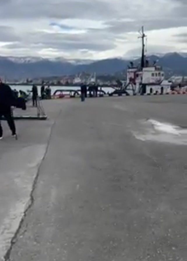waterfront scene with several people present. The ground is paved with a gray surface. To the left of the frame, a man is walking, holding something that appears to be a cane. Further away, several individuals are gathered, their actions unclear. In the background, a large white and red vessel is visible, along with a body of water that leads to snow-capped mountains. The sky is overcast, with patches of light breaking through the clouds. The overall setting appears to be a harbor or port.
