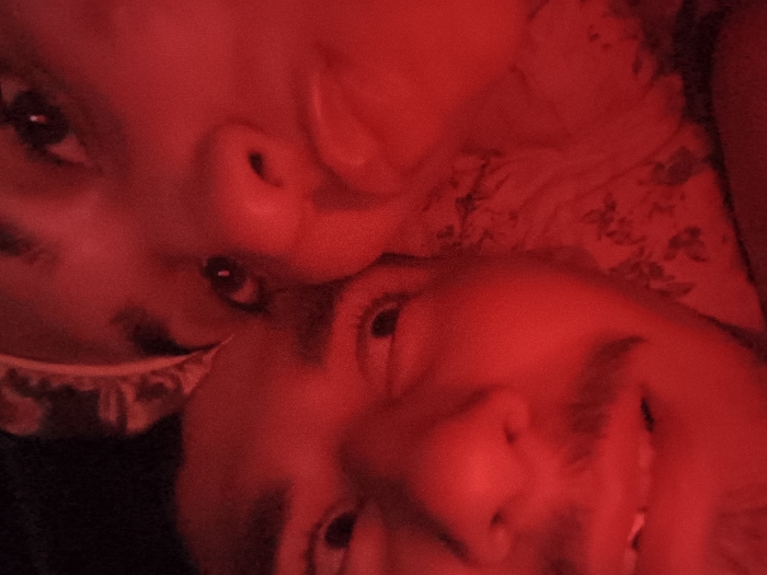 This image, taken in the city of Gorna Oryahovitsa, Bulgaria, depicts two individuals in a close-up, dimly lit, red-toned setting, likely indoors