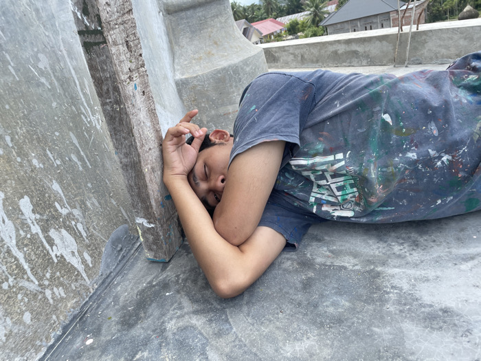 A male subject is observed lying on his left side on a concrete surface, identified as a rooftop, in Mns Asan, Indonesia. The subject is wearing a dark-colored t-shirt extensively splattered with various colors of paint. His eyes are closed, and his right hand is positioned near his face with fingers slightly curled, while his head rests on his bent left arm. A vertical wooden beam, exhibiting paint marks, is situated directly adjacent to the subject's head. The concrete rooftop surface displays cracks and scattered white paint splatters. In the background, beyond a low concrete barrier, a residential area is visible, featuring various houses with distinct rooflines and surrounding vegetation under natural light.