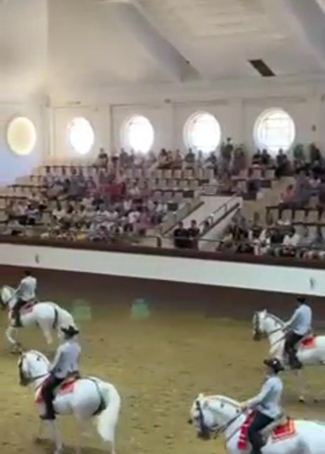 A medium, wide-angle shot shows a crowd of people watching a horse show in a large arena. The camera pans up to show the audience in tiered seating around the ring. Several horses and riders are performing in the ring, all wearing similar garb. The horses are white, and the riders wear dark hats and pants with gray or white shirts and red or orange ornamentation. The ring is a pale brown and appears to be made of sand. The arena itself is indoors, with a vaulted white ceiling and round windows. The lighting is bright and even. The general atmosphere is one of a formal, traditional performance, with the audience respectfully observing the horses and riders.