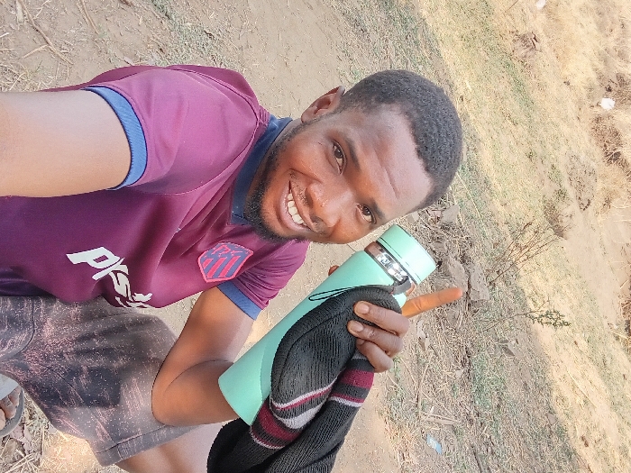 A male subject is depicted in a medium-close, slightly low-angle outdoor shot in Kugbo, Nigeria. The subject, an adult male of apparent African descent, has short dark hair and a beard, and is smiling directly at the camera. He is wearing a maroon short-sleeved t-shirt with blue trim on the sleeves, displaying a striped emblem on the left chest and white lettering on the lower torso. Dark patterned shorts are also visible. The subject holds a light teal insulated bottle with a silver band in his right hand, which also holds a black fabric item with red and white stripes. His right index and middle fingers are extended upwards in a V-shape. The background consists of dry, light brown soil with sparse patches of light green grass and dry vegetation, suggesting an arid or uncultivated outdoor area.