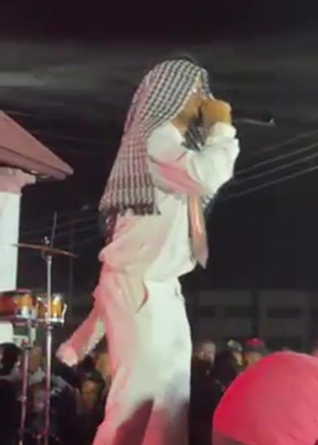 A man dressed in all white clothing and a headscarf is performing on a stage in front of a crowd of people. He is holding a microphone and gesturing with his other hand, appearing to be singing or rapping. The stage is lit with red lights, and there are musical instruments behind him. The crowd is dense and appears to be enjoying the performance. The background shows buildings and streetlights, suggesting the event is outdoors at night.