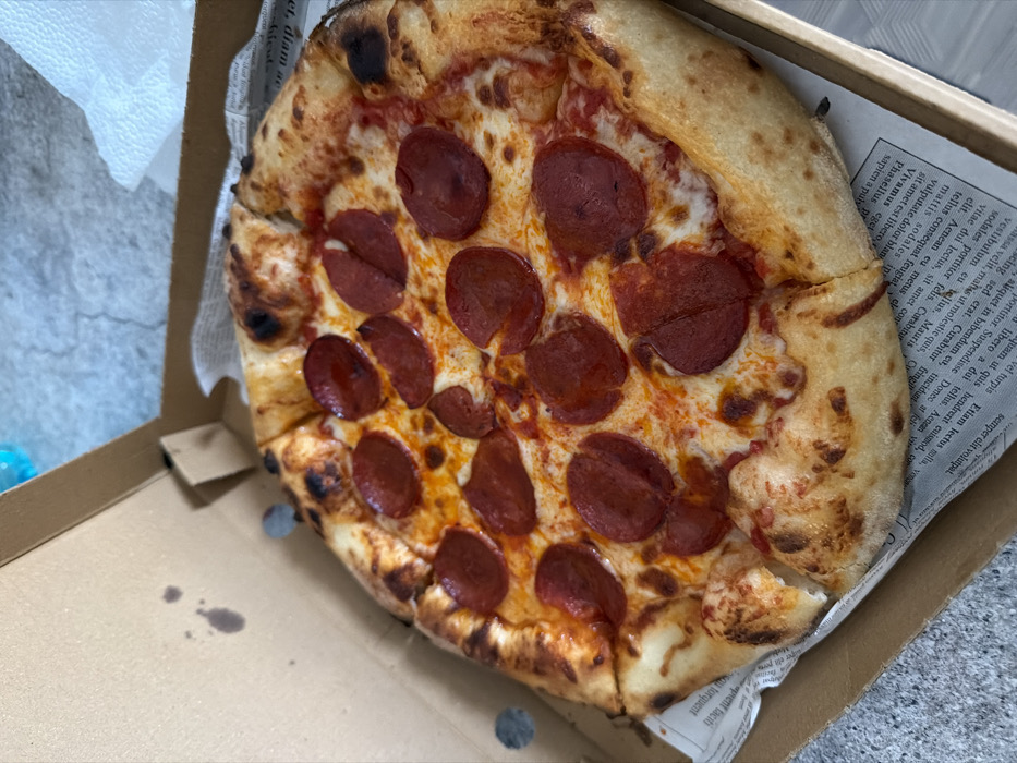 - "An overhead, slightly angled view captures a freshly prepared pepperoni pizza contained within an open, light-brown cardboard pizza box" by FM-7eYfh2, licensed under CC BY 4.0