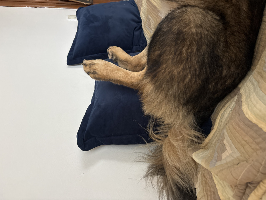 The scene depicts a domestic interior in Kunje, Montenegro. A medium to large-sized dog, exhibiting brown, tan, and dark sable fur patterns, is positioned inverted on a bed. Its hindquarters, fluffy tail, and two rear paws are visible. The dog's tail extends towards the lower left, while its two rear paws are bent at the hocks and project upwards. The dog rests on a quilted comforter or blanket, which features a geometric pattern in shades of beige and light brown. Behind the dog, two dark blue rectangular pillows are situated against a plain white wall. A segment of a dark brown wooden doorframe or furniture is visible on the far right, with a small, light-colored rectangular object mounted on the adjacent white wall.