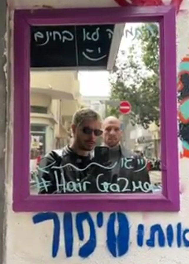 Two men are seen in the reflection of a mirror that is mounted on a wall covered in graffiti. The man in the foreground is wearing sunglasses, a black leather jacket, and has light blonde hair. He is holding a black smartphone and seems to be recording a video. The man behind him has a shaved head and is wearing a grey sweater and a black leather jacket. The mirror has a purple frame and there are some words written on the glass, including the hashtag "#Hair Go2Home". The wall is covered with colorful graffiti in both English and Hebrew. A street with buildings, trees, and a "do not enter" sign is visible in the background through the reflection of the mirror.