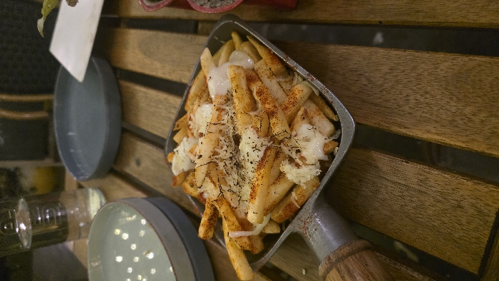 - "A square metal skillet with a wooden handle contains a serving of golden-brown french fries, heavily topped with a white sauce, grated cheese, a reddish-orange seasoning, and dark specks of spice" by FM-70rZN2, licensed under CC BY 4.0