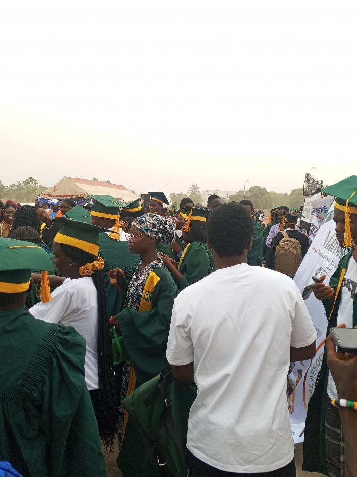 A crowd of people wearing green graduation gowns and caps gather outdoors. Many have yellow accents on their caps and gowns. In the foreground, a person in a white t-shirt stands with their back to the camera. Behind them, graduates mingle, some wearing patterned head coverings or carrying bags. A banner with text is partially visible on the right. Tents can be seen in the distance, under a hazy sky.